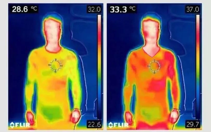 在热感仪的显示下,可以明显的看到,桃内羊毛蚕丝保暖内衣的保暖性要好很多。